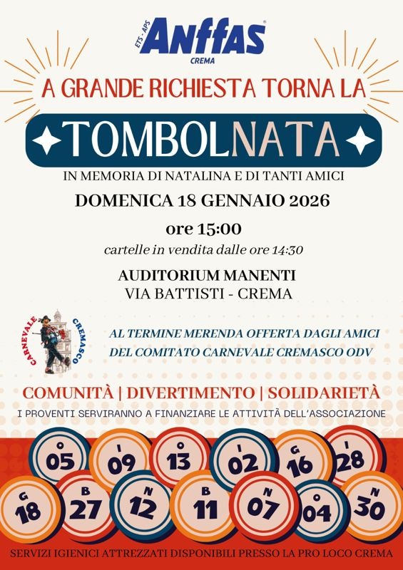 La TombolNata – diretta ancora una volta dal simpatico Marco Gipponi – vi attende. “La nostra tombolata torna a grande richiesta. Ci piacerebbe registrare ancora il pubblico delle grandi occasioni per vivere insieme un bel momento d’allegria, contribuendo alla solidarietà e all’inclusione. Grazie di cuore alla diocesi, al Carnevale Cremasco Odv e alla Pro Loco per la collaborazione”, aggiunge ancora Martinenghi. Un grazie va a tutti gli sponsor e ai privati che hanno messo a disposizione i premi e che contribuiranno alla buona riuscita dell’evento. “Vi aspettiamo numerosi per festeggiare insieme questo anno nuovo appena arrivato, che speriamo possa essere migliore di quello che abbiamo appena lasciato alle spalle”.
