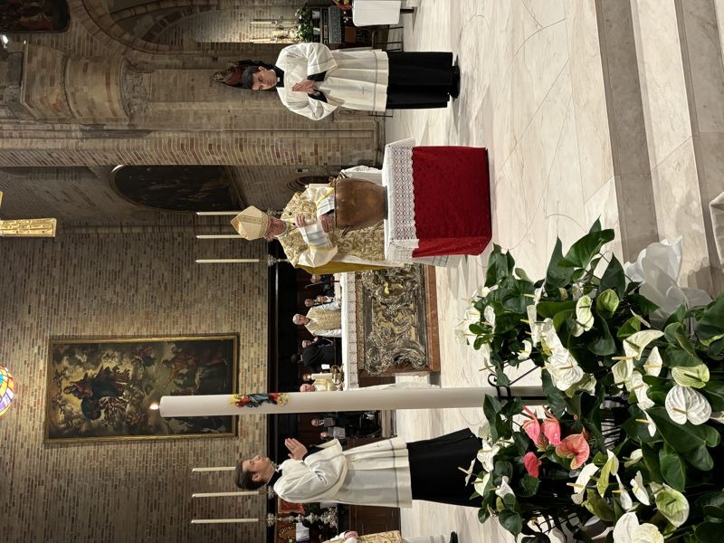 Sabato Santo, alle 15.30, sempre don Frassi benedirà le uova, simbolo della vita che si dischiude, e quindi della Pasqua. Alle 21.30, invece, il vescovo presiederà la celebrazione più importante di tutto l’anno liturgico: la Veglia Pasquale, che inizierà in piazza con la benedizione del fuoco e l’ingresso in Duomo nell’oscurità, rotta solo dalla luce del cero pasquale e dalle fiammelle che via via si accendono da esso, fino all’esplosione di luce e suoni all’intonazione del Gloria. Quest’anno, grazie alla disponibilità del Comune e della società Teike, durante i riti iniziali della Veglia verrà completamente spenta l’illuminazione pubblica, così da rendere ancora più suggestiva l’accensione del cero.