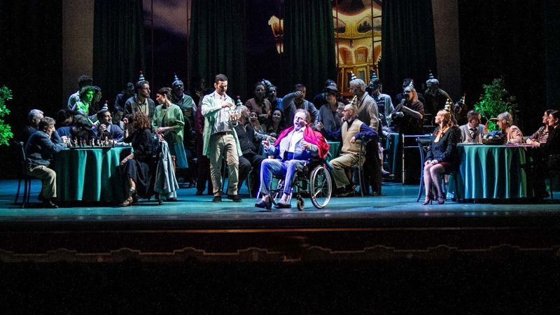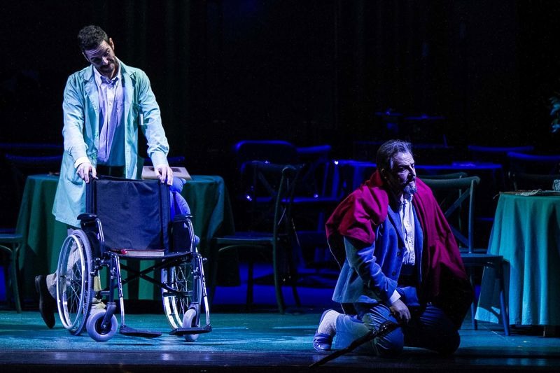 Un allestimento dal doppio volto. Molto accattivante dal punto di vista musicale. Sicuramente un po’ meno sotto l’aspetto registico e della messa in scena. Fin troppo eccessiva la libertà interpretativa laddove il povero Don Chiosciotte, già oberato pesantemente dalla senescenza del libretto di Cain, è stato rappresentato come un anziano ben degno di una casa di riposo. Il suo cavallo sostituito con una sedia a rotelle. Le spianate iberiche tramutate in una living room di un’anonima casa di riposo; o peggio di un reparto ospedaliero riservato ai malati terminali. Ogni qualsiasi riferimento ad un pizzico di epica dell’antico personaggio di Cervantes è svanita. Sacrificata sull’altare di un’interpretazione volta a sottolineare l’anziana follia di un personaggio che comunque resta, indipendentemente da tutto, un pazzo sublime come canta la Bella Dulcinea. Anche l’anticipazione del meraviglioso strumentali dell’interludio del V atto ancor prima che si alzasse il sipario, è sembrata leggermente fuori luogo nonostante avesse un significato di ciclicità rispetto a un Don Chisciotte bambino e poi morente in un letto.