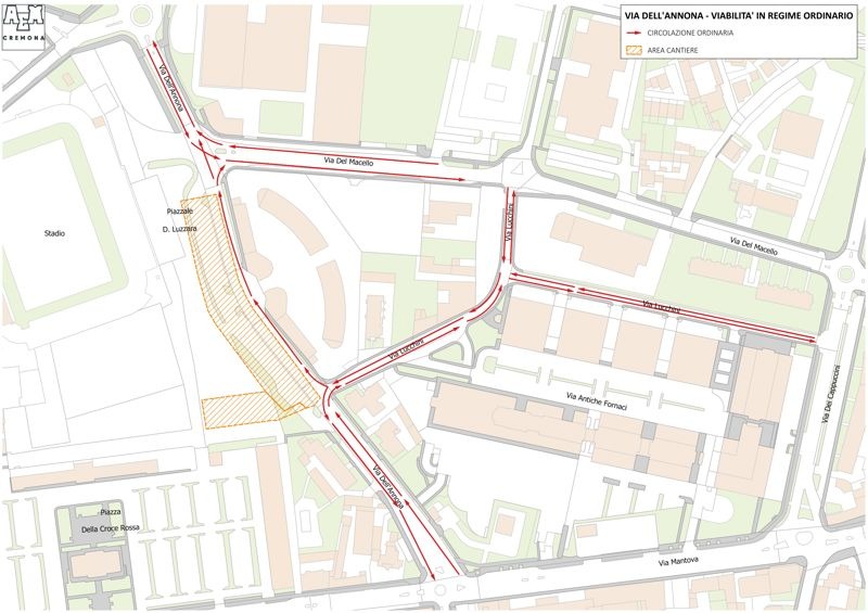 Per l'intera durata dei lavori - da dicembre 2025 a novembre 2026 - sarà istituito un senso unico di marcia in via dell'Annona tra via Lucchini e via Macello in direzione via Persico. I veicoli che percorreranno via Annona, provenendo da via Persico in direzione via Mantova, verranno deviati su via Macello - via Lucchini e si reimmetteranno su via Annona a valle del cantiere (si veda planimetria allegata).