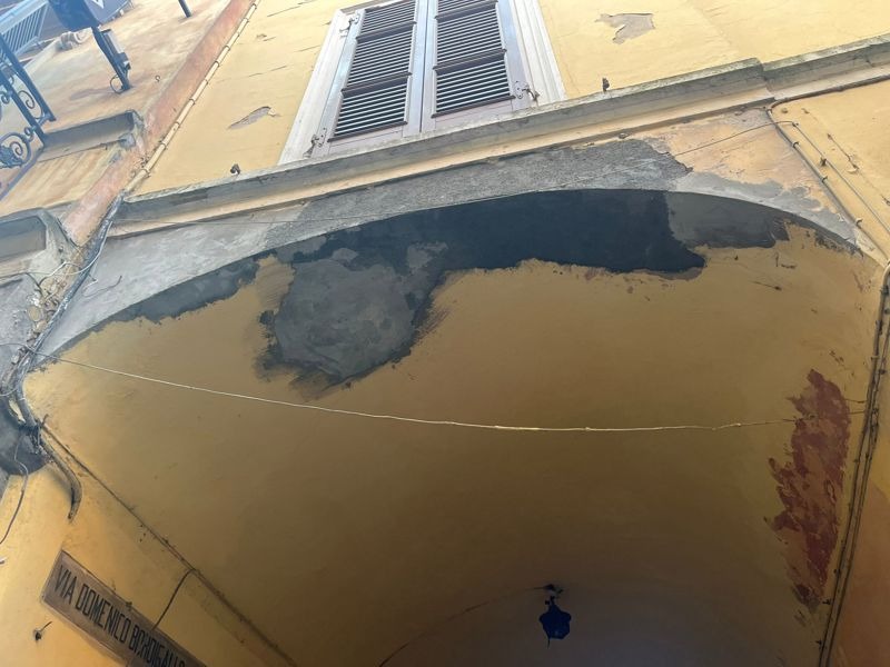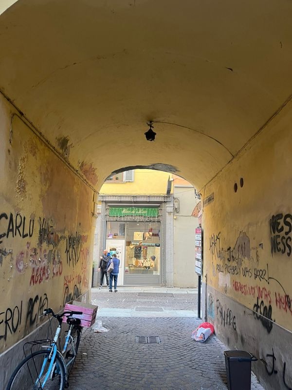 Passando sotto un piccolo voltone scrostato e rattoppato alla bell'e meglio, non è difficile notare le varipointe e poco gradevoli scritte sui muri, non una street art che possa avere qualcosa di bello da comunicare, ma veri e propri scarabocchi sgrammaticati scritti con la bomboletta spray sul muro sbrecciato. Dall'arco sopra il volto penzolano annoiati da chissà quanto tempo due fili della corrente che forse un tempo alimentavano la malinconica lanterna spenta da anni che si trova ancora appesa sotto il porticato, quasi un memento mori di questo vicolo, dove la precarietà sembra farla da padrone in effetti, a giudicare dai bidoni della raccolta differenziata con accanto sportine dell'immondizia lasciate a terra, il cartone vuoto di una pizza e altra sporcizia che rendono più un'idea di discarica piuttosto che un romantico vicoletto del centro.