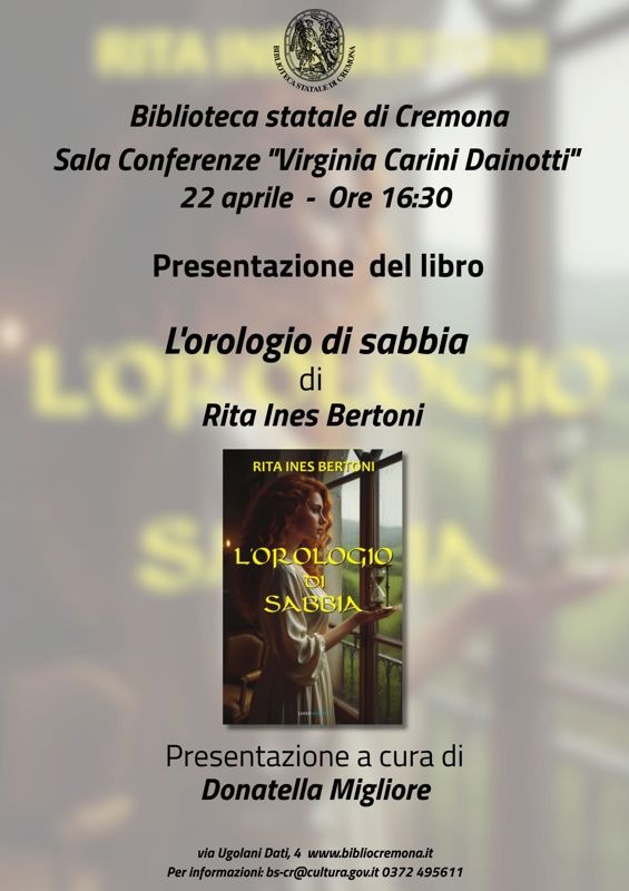 L’Orologio di Sabbia è il primo romanzo di Rita Ines Bertoni, insegnante di lingue e grande appassionata di scrittura. Mercoledì 22 alle 16.30 sarà presentato in Biblioteca statale di Cremona nella sala conferenze Virginia Carini Dainotti. Interverrà l’autrice accompagnata da Donatella Migliore.