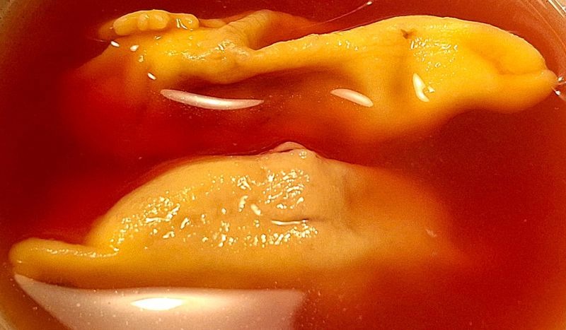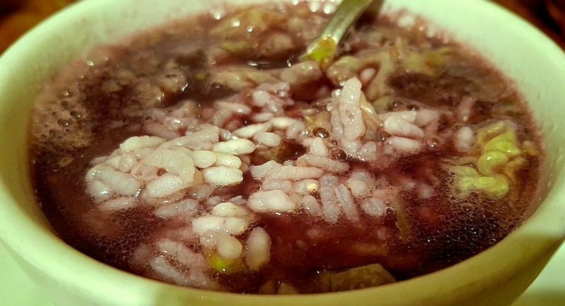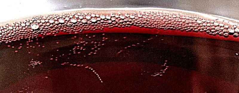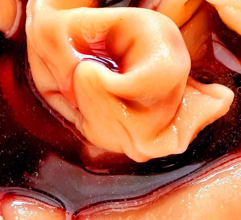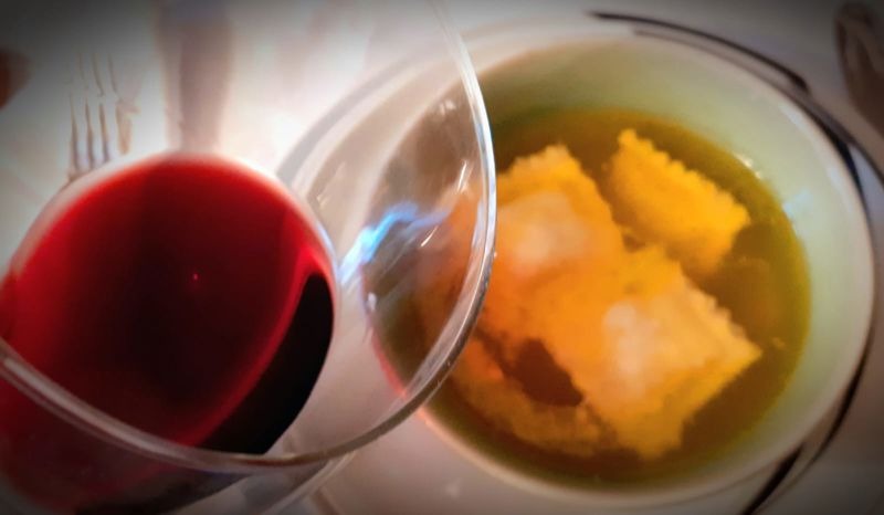 Il purpureo colore dell'enoico liquido concorre a marezzare il biondo colore del brodo di riflessi che si possono trovare nei quadri di Chagall; una vera opera d'arte, anzi d'arti (mi pare quelli inferiori) dei vari bipedi e quadrupedi che -ho il sospetto, non consenzienti- hanno dato il loro contributo alla riuscita del tutto.
