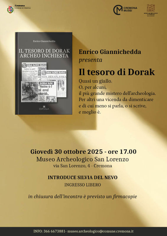 L'archeologia è certamente studio del passato, ma è anche narrazione. Narrazione che può concretizzarsi in allestimenti museali e ponderosi saggi ma anche in visite guidate, opere cinematografiche, documentari e molto altro, come, ad esempio, il romanzo giallo e il libro di inchiesta. Ne è convinto l'archeologo e scrittore Enrico Giannichedda che giovedì 30 ottobre, alle ore 17:00, al Museo Archeologico San Lorenzo (via S. Lorenzo, 4) in un incontro pubblico, introdotto da Silvia Del Nevo, presenterà il suo ultimo libro, Il tesoro di Dorak – Archeo Inchiesta (pubblicato da Edipuglia). L'ingresso è libero e, al termine, l'autore sarà disponibile per un firmacopie