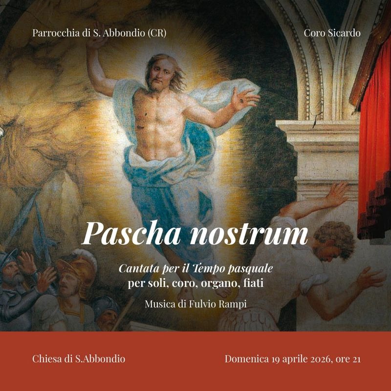 Domenica 19 aprile il maestro Fulvio Rampi, già direttore della Cappella Musicale della Cattedrale, presenterà una nuova impegnativa composizione che si colloca in continuità ideale con il proprio "Passio secundum Marcum" eseguito nell'aprile dell'anno scorso nella chiesa di S. Abbondio. Si tratta di "Pascha nostrum", una cantata sacra scritta per soli, coro, organo e fiati, che costituisce il compimento teologico-musicale del centralissimo tema pasquale inaugurato col precedente lavoro sulla passione di Cristo. Anch'esso con testi in latino tratti dalla Sacra Scrittura, dalla Liturgia e dai Padri della Chiesa, si articola in un Prologo e sei Quadri, ciascuno dei quali prende in considerazione un momento saliente del mistero pasquale secondo la narrazione biblica. La meditazione musicale prevede un nutrito organico strumentale e vocale costituito da un quintetto di fiati (Marta Zese oboe, Raffaele Magosso clarinetto, Elia Donegà corno, Antonia Tessari fagotto e Marianna Tognin flauto), dall'organo positivo (Angelo Corno), dai solisti Davide Pagliari (Narratore, tenore), Giorgio Merli (Canto gregoriano e Tommaso, tenore), Filippo Tuccimei (Cristo, basso), Francesco Spadari (Cleopa, baritono), Marina Morelli (Confessioni di S. Agostino, soprano) e Greta Bottarelli (Maddalena, soprano). Le parti corali sono invece affidate al rodato Coro Sicardo e, al suo interno, al Choro Favorito per alcuni specifici interventi.