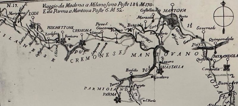 Sono poche righe, anonime, quelle della Gazzetta di Mantova, datate 20 gennaio 1770, che ricordano la fugace tappa di Mozart padre e figlio nel piccolo centro adagiato tra le attuali province di Mantova e Cremona. I due non ne faranno mai cenno nelle missive inviate alla famiglia. Sul perché di questa sosta, si può ipotizzare che ci sia stata un’esigenza pratica: quella di cambiare i cavalli. Del resto, proprio Leopold raccontava di come fosse difficoltoso muoversi in quelle strade nella stagione invernale. Carrozzabili piene di fango su cui gli animali facevano una grande fatica a muoversi. A conferma che proprio a Bozzolo era collocata una ‘posta per i cavalli’ è rimasta la pubblicazione Direzione Pe’ i viaggiatori in Italia colla notizia di tutte le poste e loro prezzi stampata a Bologna nel 1772: un esemplare è conservato proprio a Cremona alla Biblioteca Statale.