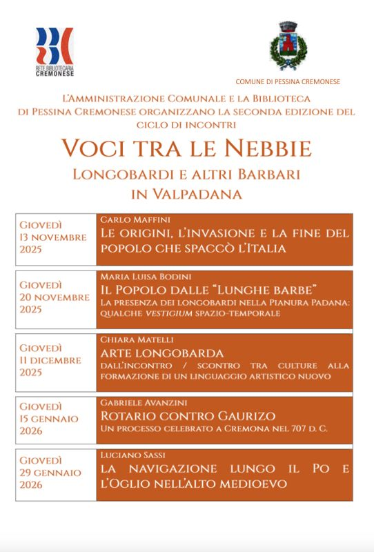 Pessina Cremonese, alla scoperta della storia delle nostre terre: al via la seconda edizione di "Voci tra le nebbie", che analizza la presenza e l'impatto dei Longobardi in Valpadana. Dal 13 novembre