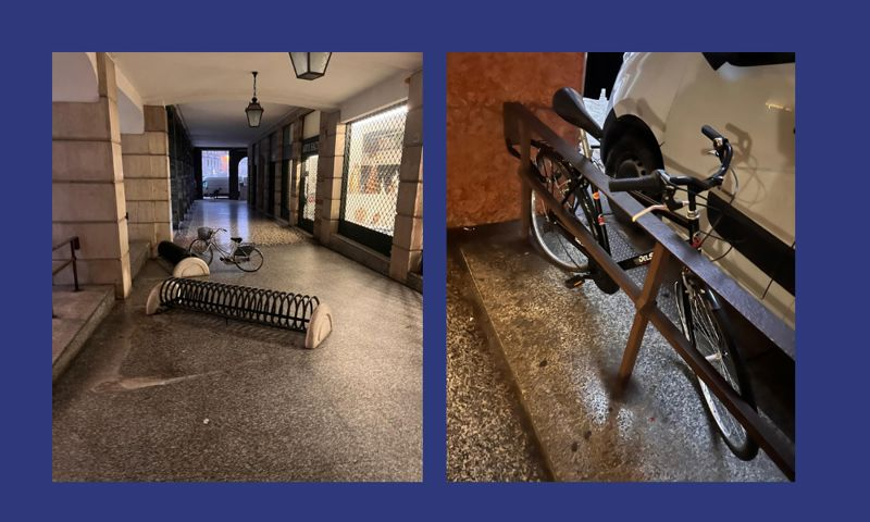 Caro direttore, di prima mattina le giro le foto del lascito dei festeggiamenti di Halloween lasciati sotto i portici della Camera di Commercio in via Baldesio questa notte. Ormai anche legare le bici alle ringhiere o porta bici non basta più distruggono tutto comunque! Ma chi vigila in centro, a pochi metri dal Comune?