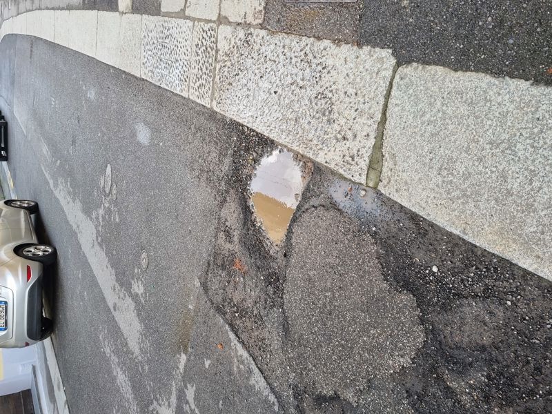 Via Volturno, una buca profondissima nell'asfalto vicino al marciapiede. Perché non si interviene?