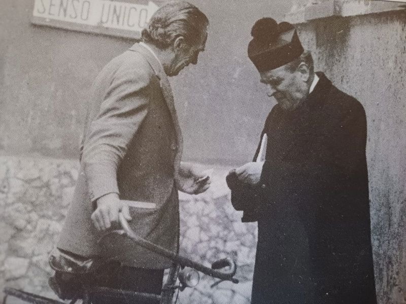 La foto mostra un gesto quotidiano di monsignor Carlo Boccazzi, la generosità con uno dei suoi molti poveri. Ricorre quest'anno il 125° anniversario della sua nascita (1901-1979). Parroco della Cattedrale, è stato per decenni tra i personaggi e le personalità emergenti della comunità cittadine "sul quale - ricordava in uno scritto don Carlo Pedretti - si accendono a volte i fuochi fatui di piccole polemiche che hanno i riflessi della non conoscenza e quindi della incomprensione". "Ciò che urtava, a volte, era la sua ingenua nostalgia per il regime -scriveva ancora don Pedretti - ma ciò che deponeva a favore della sua retta coscienza era il delicato, fermo, disinteressato intervento per gli 'umiliati e offesi' di turno"