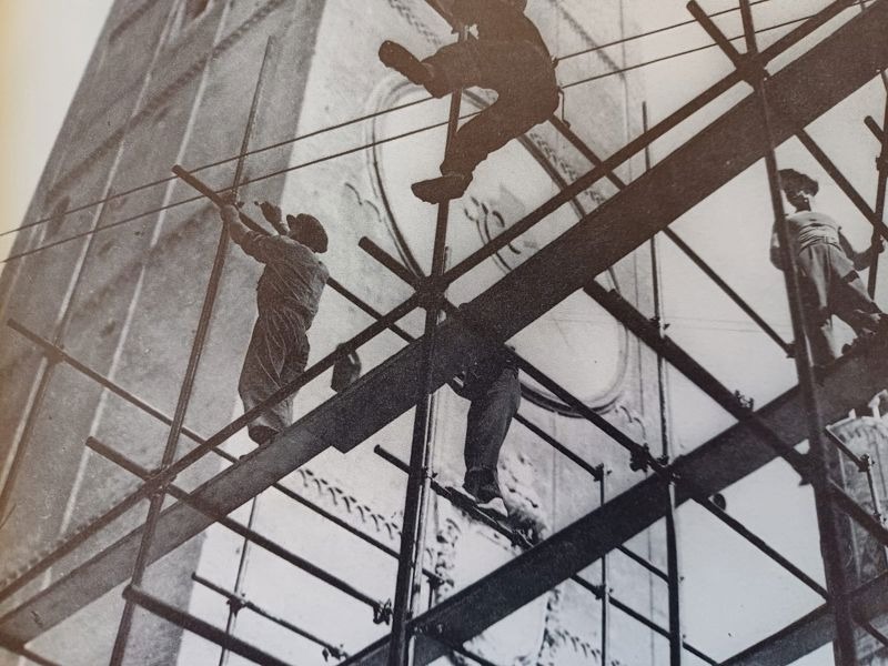 L' obiettivo di Fazioli ha colto l'allestimento del palcoscenico per la stagione operistica in piazza del Comune. Le stagioni liriche all'aperto, avvenute tra il 1932 ed il 1937 costituiscono, nella storia cittadina, un momento di grande prestigio che andava al di là del piú facile campanilismo. Il pubblico, in quegli anni, andava sempre meno al teatro «Ponchielli»> ove Roberto Farinacci nella sua veste di presidente, tentava tutte le strade, anche per eliminare una pesante morosità da parte degli stessi condomini. Nonostante si scegliessero opere di richiamo e si invitasse (spesso anche si obbligavano) nomi di cartello e celebri cantanti, il pubblico dimostrava indifferenza ed evitava di frequentare il teatro che, fra l'altro, aveva bisogno di molte cure e soprattutto di abbellimenti e di ammodernamenti nei vari servizi. Farinacci constatava invece che nelle altre città i teatri non solo erano frequentati ma le varie stagioni si succedevano alternando tutti i generi, oltre quelli musicali. Con i direttori del teatro aveva più volte discusso la questione e qualcuno gli aveva proposto, molto sommessamente, se non fosse stato il caso di imitare Verona, la città dell'arena che per l'intera estate galvanizzava il pubblico. L'idea piacque e pare che i promotori fossero alcuni giornalisti del quotidiano di Farinacci «Il regime fascista», ma il progetto venne portato all'attenzione del presidente del «Ponchielli» da due musicisti che avevano molto prestigio in città: Marco Brasi e Leopoldo Colonnelli. I promotori ebbero pochissimi giorni per concretizzare l'iniziativa. Si lavorò in tutta segretezza tanto che quando «Il regime fascista» del 23 giugno 1932 uscì con un vistoso titolo in cronaca, nessuno sapeva niente; ma coloro che di buon mattino erano in piazza del Comune si trovarono di fronte ad uno spettacolo insolito: da alcuni camion si scaricavano migliaia di tubolari, legno, seggiole. Erano le prime avvisaglie della grandiosa arena che sarebbe nata da li a poco sulla piazza del Comune. Era così nata la prima edizione della stagione lirica all'aperto con un cartellone che prevedeva «Rigoletto» di Verdi e «Il barbiere di Siviglia» di Rossini. Venne anche eseguito, a piena orchestra, il preludio dell'opera inedita «Narciso» del cremonese Oreste Riva (che era conosciuto come Pilade Sponda). Successo, naturalmente, enorme perchè la stagione fu largamente pubblicizzata e si organizzarono anche treni popolari con sconti addirittura del 50 per cento. Per centinaia di persone divenne anche l'occasione per conoscere Cremona, mai vista prima. Secondo calcoli, a consuntivo, la stagione venne a costare 120 mila lire per sera, ma gli incassi, mediamente, non superarono le 20 mila lire. I cremonesi ascoltarono Nanù Sanchioni, Mario Basiola, Dino Ederle, Dino Borgioli e molti altri. Ma nelle stagioni successive i cast si arricchirono con la presenza di Gianna Pederzini, Franco Merli, Beniamino Gigli, Tancredi Pasero, Augusta Oltrabella, Elena Nicolai, Mafalda Favero, Gina Cigna, Vincenzo Guicciardi, Giacomo Lauri Volpi, Saturno Meletti, Lina Pagliughi, Adelio Zagonara e molti altri.