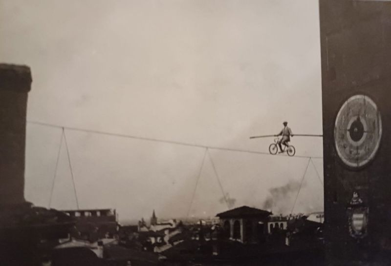 Ecco l'uomo sul filo in una vecchia cartolina di Cremona. Una volta l'anno intorno al 1910 il funambolo tedesco si esibiva in tutte le piazza d'Europa. Il suo nome era Strosneider ma per i cremonesi era "ciàpela, ciàpela". Quando si esibiva la piazza era stracolma con tanta gente che arrivava anche dalle campagne e dalle province vicine per godersi lo spettacolo su quella corda tesa tra Torrazzo e Torre Civica. Tutti erano concentrati su quell'omino in bicicletta, con il naso all'insù. E le cronache dell'epoca raccontano che dalle tasche degli spettatori sparirono orologi e portafogli.