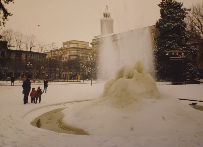 La fotografia è del grande fotografo cremonese Torquato Zambelli (nato a Cremona nel 1882) e mostra le carrozze in attesa di viaggiatori in piazza del Comune in una giornata di nebbia mentre sullo sfondo si vedono i vari di alcune auto e alcuni uomini intabarrati che attraversano la piazza. La foto è stata scattata tra il 1920 e il 1930.