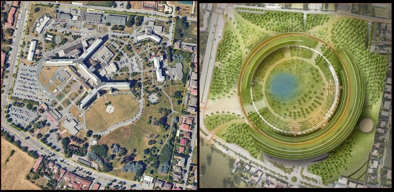 Si tratta, in sostanza, di giardini pensili distribuiti su più livelli (inizialmente sette fuori terra, ora ridotti a cinque). Nell’immagine si distingue, a sinistra, lo stato attuale dell’area oggetto di demolizione e, a destra, l’assetto finale previsto, con la sistemazione a verde, il bacino di laminazione circolare e i due edifici ad emiciclo, evidenziati dalle linee che delimitano i terrazzamenti e le coperture vegetate.