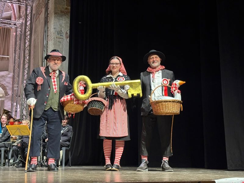 Una grande chiave, color oro, di cartapesta, simbolo della città è stata consegnata dal sindaco di Crema al Presidente del Carnevale Cremasco e al Gagèt.