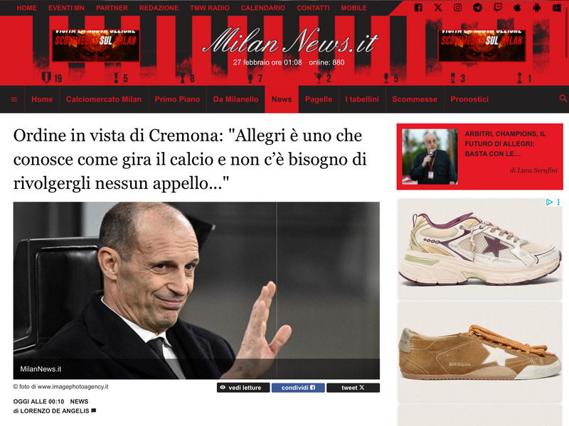 “Per il Milan mi aspetto una gara complicata. Se allo Zini non vince da trent’anni un motivo ci sarà. La Cremonese ha bisogno di punti e farlo davanti al proprio pubblico sarà fondamentale. L’andata e la gara contro il Parma insegnano che il Milan dovrà essere paziente, evitare di innervosirsi e di essere frenetico. Dovrà colpire al momento giusto, nel classico stile “a corto muso” di Allegri, per portare a casa tre punti vitali”.