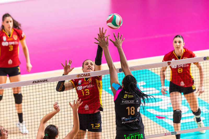 Primo set. Guidi prova la fast ma il muro di Costagli apre il match, Angelina pareggia i conti, 1-1, Guiducci manda a rete a sua battuta e rimanda le rosa avanti 2-1, Perovic fa 2-2. Capitan Costagli trova il mani out del 3-4. Bella diagonale di Kavalenka, 4-5, l'errore di Mason in attacco pareggia i conti 5-5. Tocco morbido di Ravarini che trova il 6-6. Bel primo tempo di Nwokoye che trova ferma la difesa, 7-9, la centrale poi si ripete, 8-9. Roma si porta sull'11-8, coach Cuello chiama il primo time out di gara. Si torna in campo e l'errore di Angelina fa 9-11. Kavalenka spara il suo tentativo e trova il -4, 10-14. Il mani out di Costagli è vincente, 11-15, Mason poi manda out il suo tentativo, 12-15. Roma fa 17-12, altro time out per coach Cuello. Melissa Marku trova il 13-21. Marku sigla il primo ace dell'incontro, 15-22, il murone di Nwokoye accorcia, 16-22. L'attacco di Kavalenka è vincente, 17-23, il murone ancora di Nwokoye accorcia nuovamente, 18-23. Il muro di Ravarini chiude il break, 19-23, time out per coach Cuccarini. Si torna in campo e la diagonale di Ravarini è un missilie, Zannoni non può nulla, 20-23. Perovic trova la palla del set 24-20, Nwokoye annulla la prima palla set, 21-24. Perovic chiude 25-21. Top scorer: Perovic 9, Nwokoye 5
