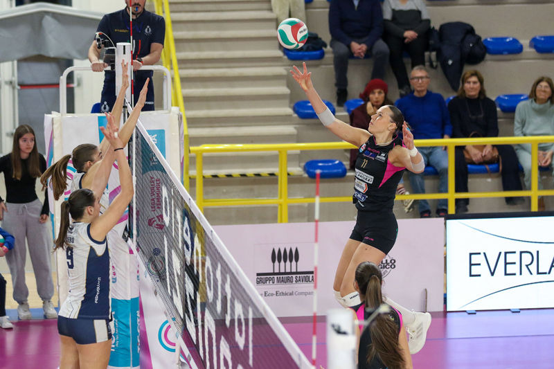 Le isolane sono state spesso vicine se non in parità nel punteggio, ma le tigri gialloblù hanno giocato ogni periodo con lucidità e determinazione, riuscendo così riprendere la marcia in classifica. La regia illuminata di Sofia Turlà (3 punti di cui 2 muri) mette in luce la MVP Veronica Taborelli, autrice di 19 punti col 47% in attacco e manda in doppia cifra anche Alessia Arciprete con 10. Brillante anche il gioco al centro, con Munarini e Modesti che firmano 16 punti in coppia. Parlangeli garantisce concretezza e sicurezza in seconda linea (73% di ricezione positiva). Proficuo anche l’apporto delle subentrate in corso di gara. Per l’Hermaea 8 punti firmati Barbazeni, 7 per Partenio e e 6 per Ngolongolo, con Blasi reattiva e puntuale dietro. Cremona ora volge lo sguardo al quarto di finale di coppa Italia di mercoledì contro San Giovanni in Marignano, Olbia invece ospiterà Albese domenica al GeoPalace.