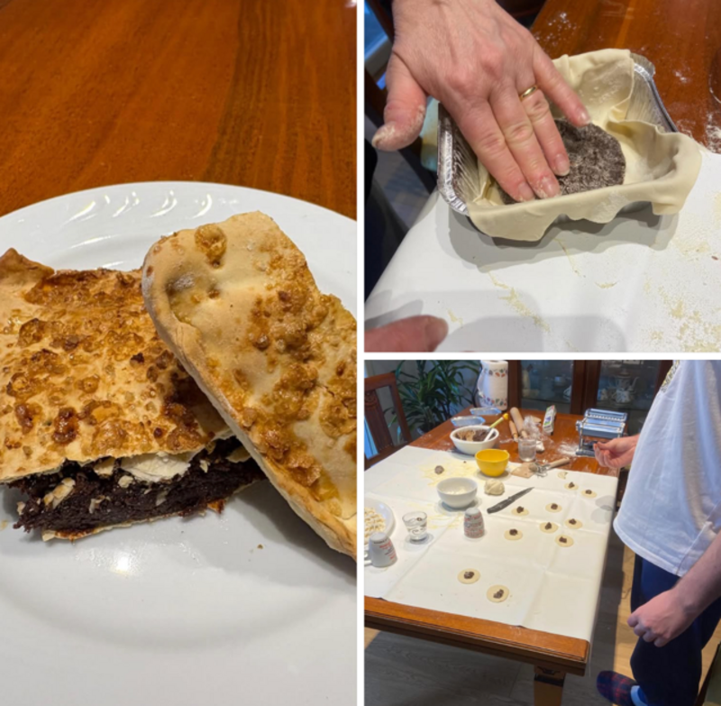 "Fare i tortelli in casa è un lavoro di squadra a cui non partecipavo da decenni. E il finale è spesso inventarsi qualcosa con impasto e ripieno rimanenti. E quindi ecco una tortina al forno col l'impasto a foderare una teglietta e tanto ripieno a fare da morso dolce. Risultato? Una curiosa tortina dolce al tortello cremasco".
