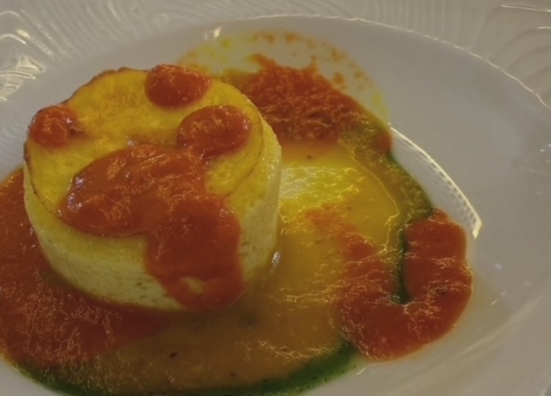 Per questo menu 2025 abbiamo pensato ad un antipasto che raccontasse il territorio, ma con un pizzico di colore: Flan di Salva Cremasco con crema di peperoni in agrodolce.